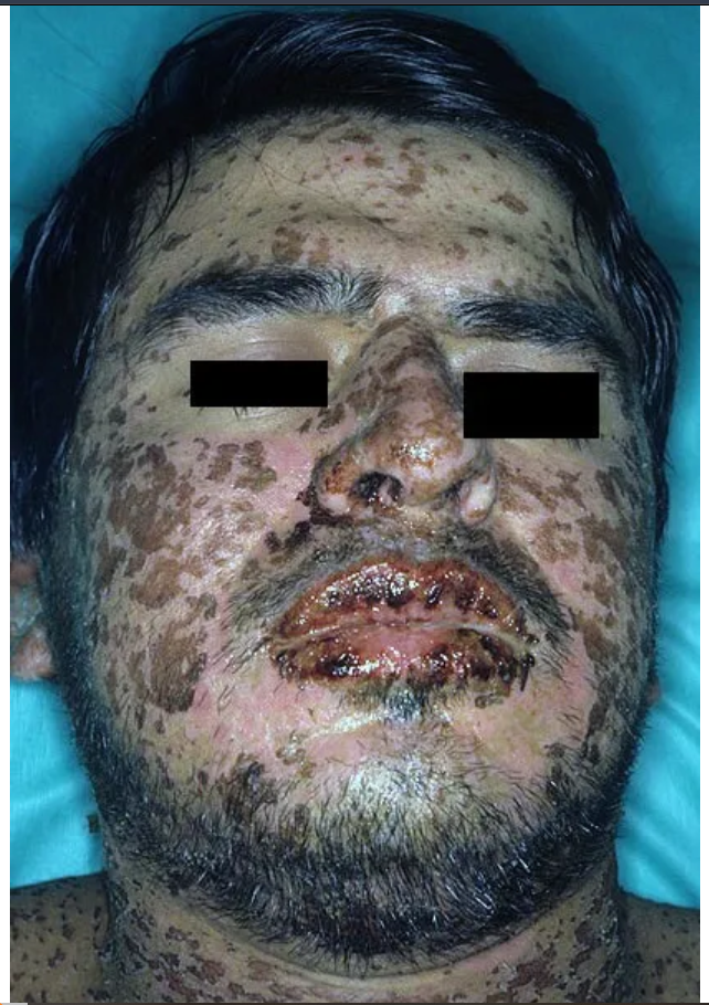 It usually starts with flu-like symptoms but quickly progresses into a dangerous skin condition where the top layer of the skin begins to die and peel away.